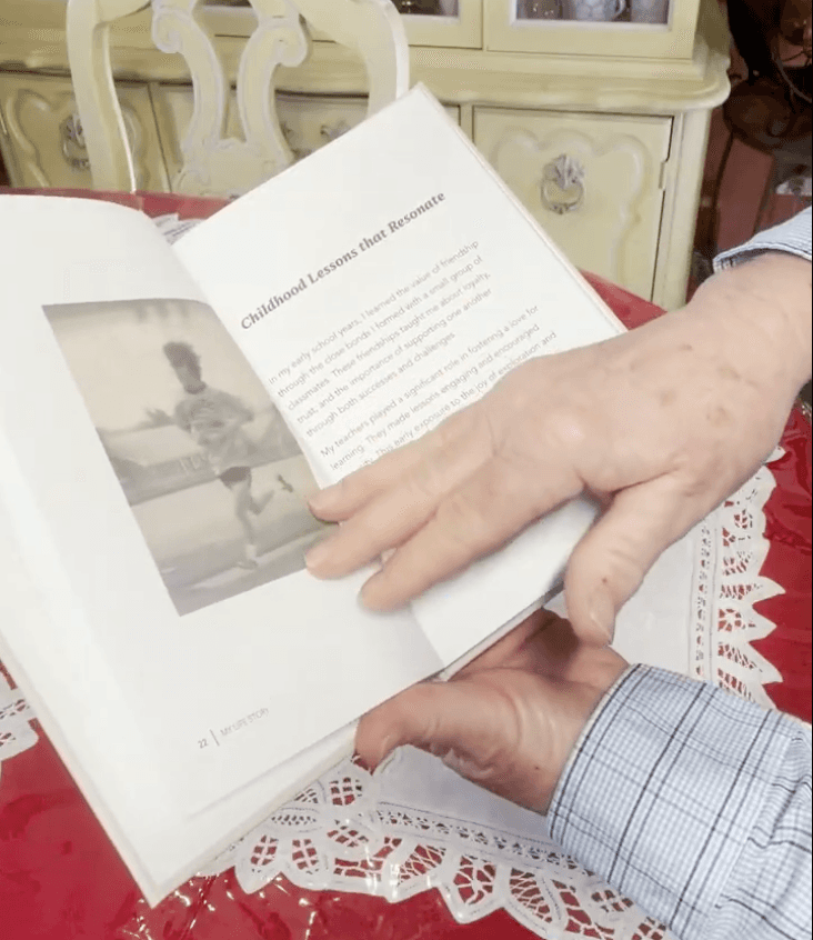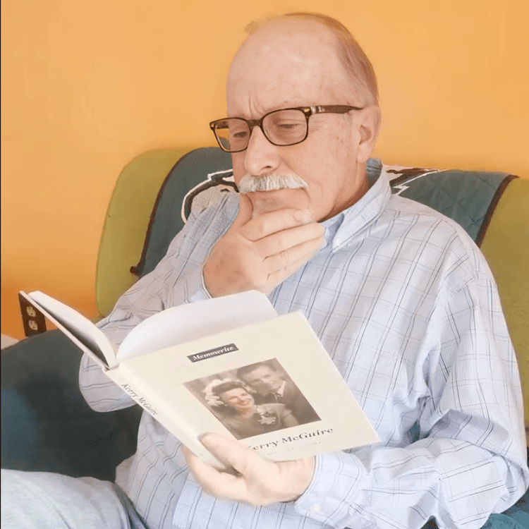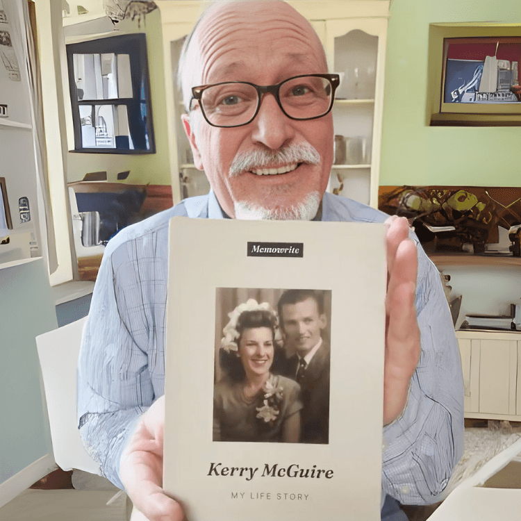 You get 50 easy questions. You answer at your own pace. They turn it into a hardcover book – your name, your face, your story.